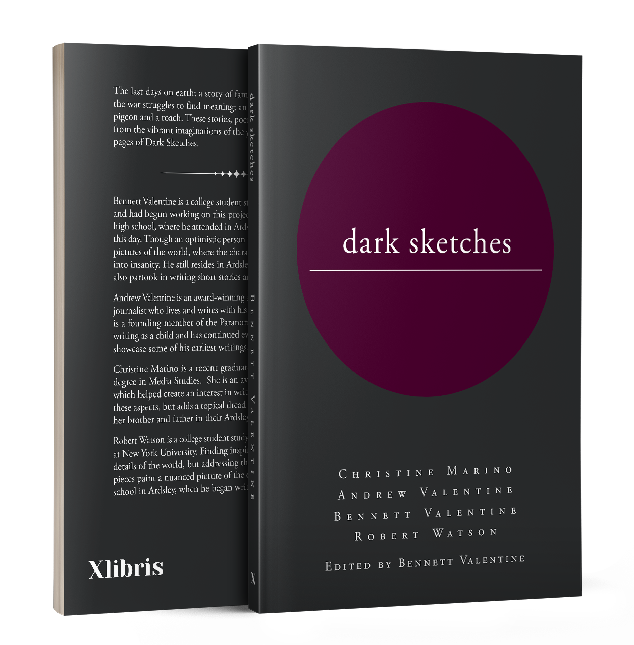 Bennett Valentine is a college student studying Film at SUNY Purchase, and had begun working on this project during his sophomore year of high school, where he attended in Ardsley, and he continues writing to this day. Though an optimistic person in society, Bennett paints dismal pictures of the world, where the characters’ introspection drives them into insanity. He still resides in Ardsley with his sister and father who also partook in writing short stories and poems in the book.
